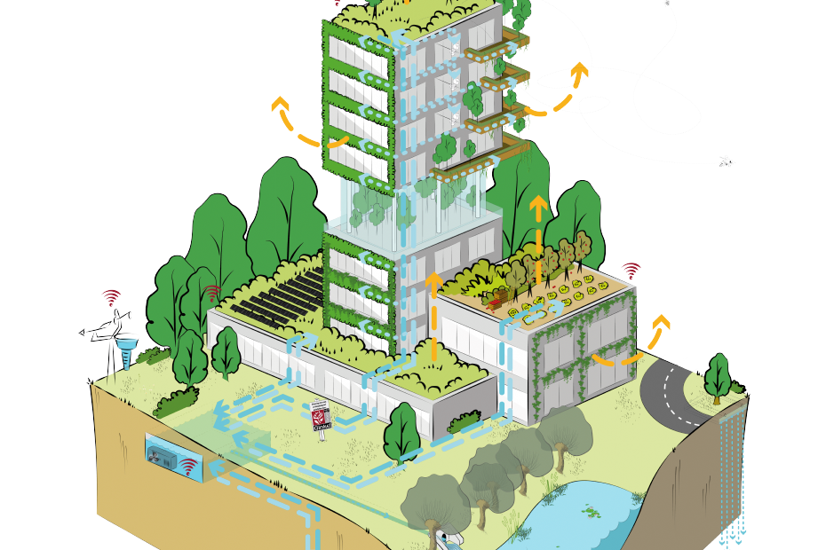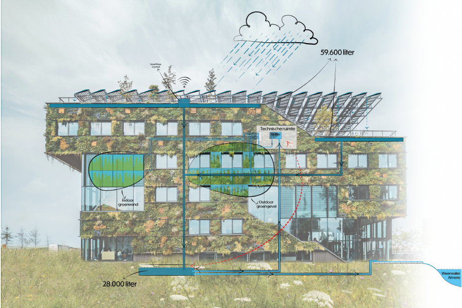 | | Voorbeeld van een watercirculair gebouw. Dit heeft een gesloten waterbalans. Opgevangen regenwater wordt slim ingezet voor groen en gebouw. |
