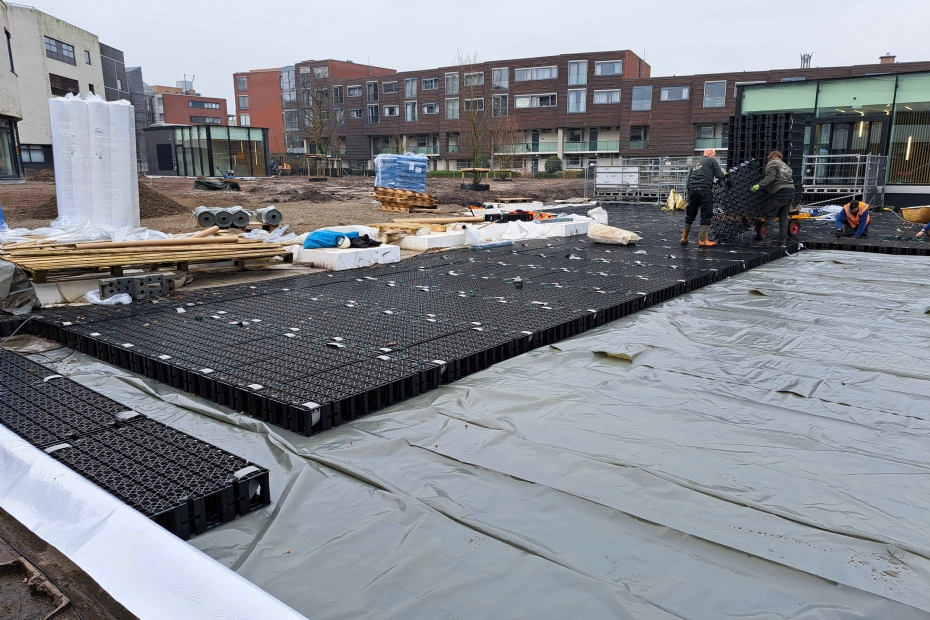 Afgelopen herfst en winter had Nederland te maken met uitzonderlijk veel regenval. In Noord-Holland misschien nog wel meer dan elders en dat leverde lastige omstandigheden op bij de realisatie van het project. 'Het was echt een uitdaging om het water van het dak af te krijgen,' vertelt Rob Scholten, werkvoorbereider bij De Enk Groen & Golf. De wateroverlast bewees echter direct de noodzaak van dit project. 'Een retentiedak biedt de ideale oplossing voor het bergen van grote hoeveelheden water.'