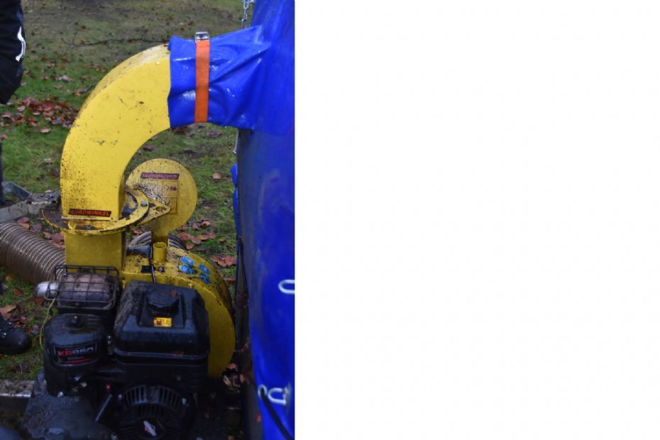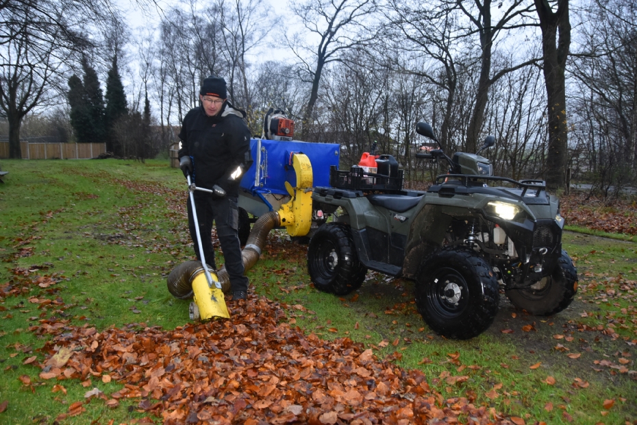 Een collega van Averesch, Roy, is ondertussen aan het blad ruimen op de grasvelden van het beboste terrein. Het gevallen blad heeft hij op rillen geblazen; die zuigt hij nu op met een miniatuur-bladzuiginstallatie. Via de circa 20 cm brede zuigmond verdwijnt het blad door een 5 meter lange flexibele buis naar de zuighakselaar. Deze is gemonteerd op de dissel van een aanhanger met huif, die aan de quad gekoppeld is. De gele hakselaar, aangedreven door een Honda 250cc-viertaktbenzinemotor, heeft er duidelijk zin in. Hij hakselt en verkleint het aangezogen blad en blaast dit in de gesloten aanhanger, waar ruimte is voor circa 1,5 kuub. Op de hakselaar staat te lezen dat ook deze door Quadwinkel is geleverd.
