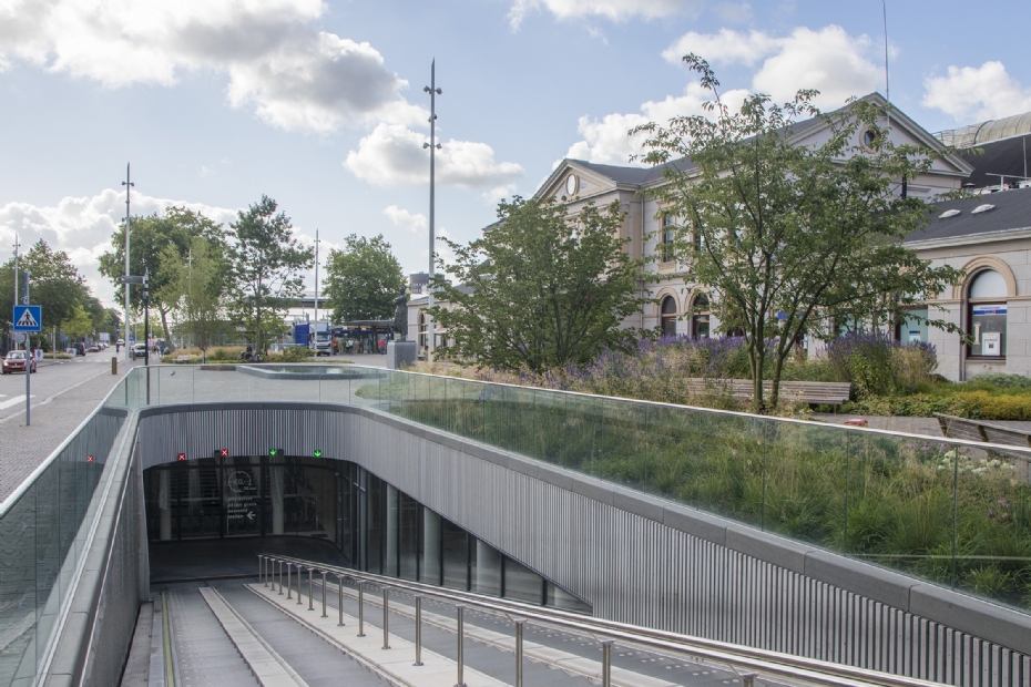 | | Ondergrondse fietsenstalling met rechts meerstammige Cornus en Prunus Yedoensis |