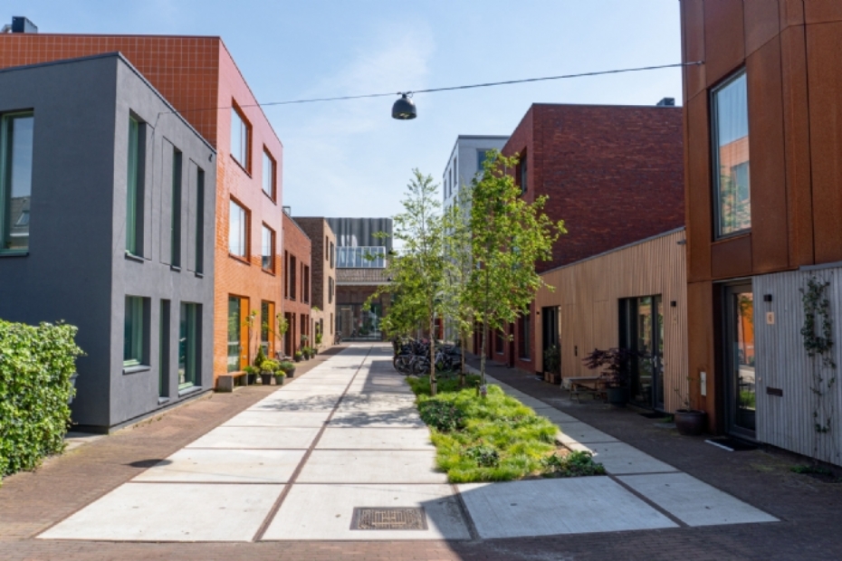 | | New Urban Standard. Een heerlijke koelteplek in stedelijk gebied: Overhoeks, een gemeenschappelijke binnentuin op het dak van een parkeergarage (openbaar terrein). De tuin zorgt voor de waterhuishouding van de bebouwing en de tuin zelf. |