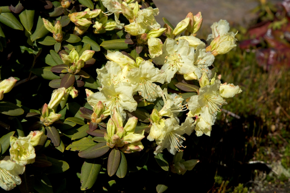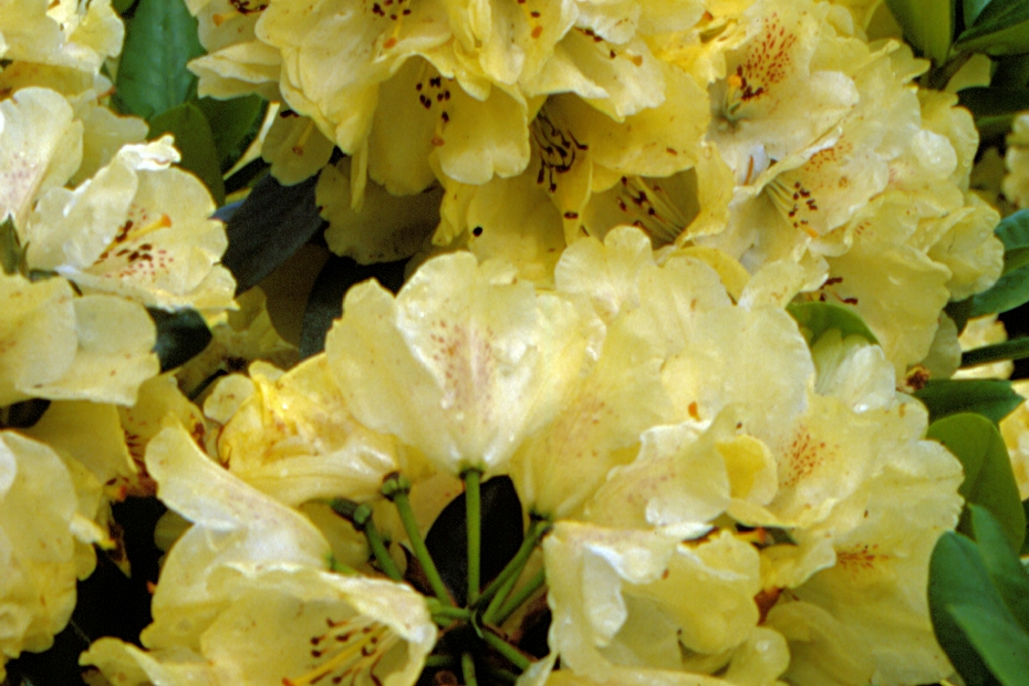 Ongeschubde wilde soortenEr worden ruim 1.000 natuurlijke soorten Rhododendron onderscheiden. Veruit de meeste hiervan komen voor in Oost-Azië en de Himalaya, maar ook elders in Azië, Europa, Noord-Amerika en Australië komen rododendrons voor. Afgezien van de groepen Japanse azalea en bladverliezende azalea is een deel van de soorten niet winterhard en voor ons dus niet van belang. Maar dan nog blijft er een behoorlijk aantal soorten over, waarvan een deel geel bloeit. Uit de ongeschubde geelbloeiende soorten Rhododendron caucasicum, R. campylocarpum en R. wardii zijn de meeste cultivars en hybriden ontstaan. R. wardii is genoemd naar de Engelse planthunter Frank Kingdon-Ward (1885-1958), die veel planten vanuit Zuidoost-China en de Himalaya in het westen introduceerde. Deze soort komt voor in Tibet en de aangrenzende Chinese provincie Yunnan. Het is een forse struik, die gemakkelijk enkele meters hoog en breed kan worden. De bladeren zijn breed ovaal en iets glanzend middengroen. De bloemen zijn citroengeel tot diepgeel, vaak met een kleine rode vlek in het hart. Deze vlek wordt 'macule' genoemd, een term die veel gebruikt wordt als het om bloemen van rododendrons gaat. R. campylocarpum blijft iets lager dan R. wardii en heeft een iets westelijker verspreidingsgebied in de Himalaya. De bloemen zijn bleekgeel tot heldergeel.Zoals de naam al verraadt, komt R. caucasicum van nature voor in de Kaukasus. Het is een dichte, lage en brede plant die ongeveer 1 m hoog wordt. De bloemen, die crèmekleurig en bleekgeel zijn, openen in april en mei. R. caucasicum is veel gebruikt in kruisingsprogramma's, vaak niet met het doel om geelbloeiende cultivars te ontwikkelen, maar vanwege de groeiwijze en de uitstekende winterhardheid. De cultivar 'Luteum' bloeit met gelere bloemen. Natuurlijk zijn er diverse andere geelbloeiende soorten in deze groep, maar die zijn onvoldoende winterhard in Nederland en België of ze worden niet gekweekt.