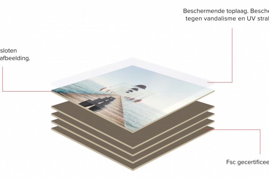 Rogier Biekens van VERHEES PRODUCTS legt uit wat het bijzondere aan de CHPL-panelen is. 'We bieden CHPL sinds een tijdje aan naast sublimatie, een andere druktechniek. Dit zijn twee types producten die ideaal zijn voor de openbare ruimte als informatieborden. CHPL is opgebouwd uit laagjes hergebruikt papier, waarna een laag met de print volgt. Hier gaat dan weer een laagje hars overheen en dan wordt het geheel geperst tot een mooie plaat. Je kun hem indien gewenst ook tweezijdig bedrukken. We hebben hiermee een echt duurzaam bord. Aan het eind van de levensloop kunnen we het bord ook weer innemen voor recycling.' VERHEES PRODUCTS past de CHPL-methode steeds vaker toe op de grotere informatieborden. 'Het is een hufterproof product. Als mensen het bekladden met inkt of verf, dan kun je het er heel gemakkelijk af poetsen. Als er een mes door het oppervlak gaat, heeft het weer geen invloed op het product. Het bord is bestendig tegen alle weertypes en omgevingen die vochtig en zout zijn. Zo'n paneel is dan ook prima aan de kust te plaatsen. We geven er vijftien jaar garantie op. Het is ook uv-bestendig en mag dan ook in die tijd niet verkleuren.' Volgens Biekens past het CHPL-paneel vanwege genoemde eigenschappen uitstekend in natuurgebieden. 'Het product heeft een natuurlijke uitstraling en je kunt er mooie vormen mee maken en diktes van 3 tot en met 13 millimeter, de maximale grootte is 1,5 bij 3 meter. Het is ook mogelijk om het oppervlak te laten uitfrezen. Het informatiebord kan passend aan elke omgeving worden ontworpen en gemaakt.'