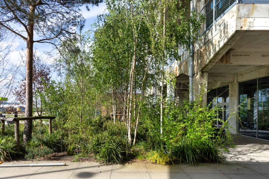 Bomen en overige beplanting verrijken de werkomgeving, dragen bij aan het welzijn van gebruikers en zorgen voor een prettige, informele en inspirerende sfeer. De buitenruimte en corridor zijn ingericht met lokale soorten afkomstig van Boomkwekerij Ebben, waaronder grove den, eik, berk, brem, varens en grassen, met als resultaat een ruig, bosachtig landschap dat perfect aansluit bij het gebouw.