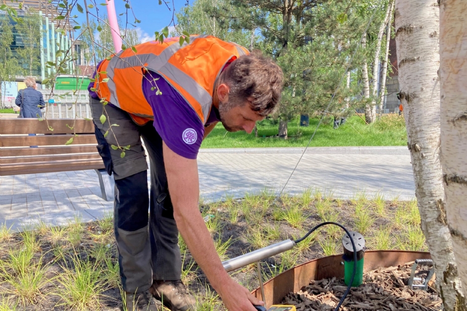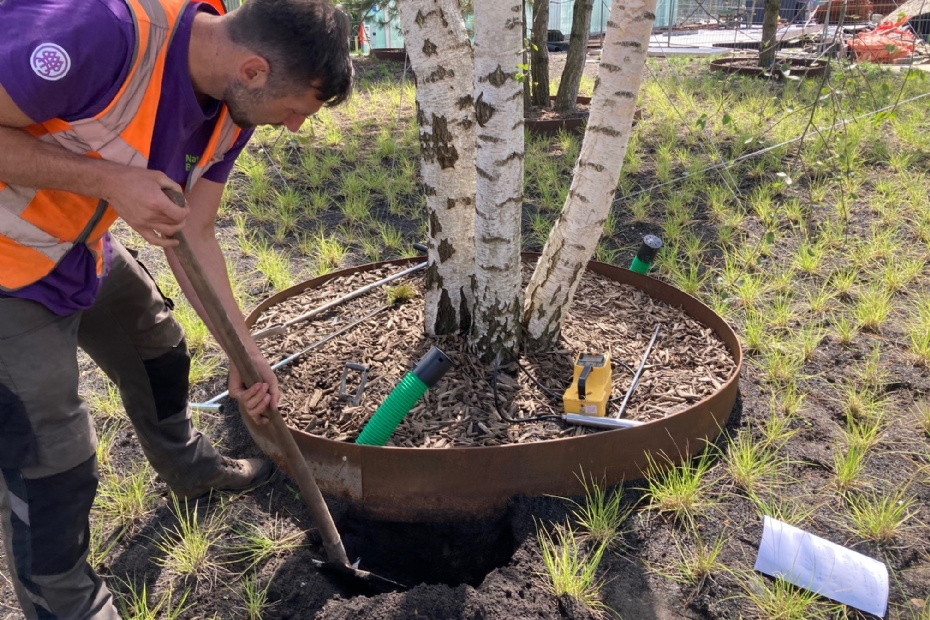 Een ander veelvoorkomend probleem dat onze nazorgadviseurs tegenkomen, is een te natte groeiplaats. Dit kan verschillende oorzaken hebben, zoals bijvoorbeeld: • een van nature natte locatie; • verslemping of structuurbederf van de bodem tijdens de aanleg; • schade aan de bodemstructuur door latere werkzaamheden rond de boom; • een plantgat dat fungeert als afvoerput voor omliggend water; • een groeimedium dat te veel water vasthoudt. Al deze situaties leiden tot zuurstofgebrek in de bodem, wat de wortelontwikkeling ernstig belemmert. In zulke gevallen is water geven niet alleen overbodig, maar zelfs schadelijk. Het versterkt het negatieve effect alleen maar. Daarom is het essentieel om bij natte groeiplaatsen eerst de oorzaak te achterhalen en gerichte maatregelen te nemen, voordat er überhaupt aan water geven wordt gedacht. Kortom, het geven van water aan bomen in de nazorgfase is een vak apart. Het draait om de juiste balans tussen de boom stimuleren om zelf op zoek te gaan naar water, en weten wanneer ingrijpen noodzakelijk is. Daarom geldt: geef water op basis van behoefte, niet op basis van frequentie. Om dit goed in te schatten, is maatwerk nodig. Denk aan: per boom bepalen wat de waterbehoefte is; in het veld de bodemvochtigheid meten, bijvoorbeeld met een grondboor, en lokale neerslaggegevens van het KNMI analyseren. Vochtsensoren kunnen hierbij een waardevol hulpmiddel zijn, maar ze moeten altijd als indicatie worden gebruikt, niet als enige bron van informatie. Een sensor kan bijvoorbeeld aangeven dat het buiten de kluit nat is, terwijl de kluit zelf gortdroog is, of andersom. Alleen door meerdere bronnen te combineren, kun je verantwoord en effectief water geven. Naast uitdroging van de kluit of juist vernatting en zuurstofgebrek, zijn er tal van andere factoren die een pas aangeplante of verplante boom kunnen bedreigen. Bomen die worden geplant op locaties waar nog bouw- of reconstructiewerkzaamheden plaatsvinden, lopen bijvoorbeeld continu risico op schade of verstoring. Het is daarom essentieel om knelpunten tijdig te signaleren en snel passende maatregelen te nemen. Dit begint bij regelmatige controle van de boom. De meeste problemen zijn terug te voeren op de ondergrondse groeiomstandigheden en de mate waarin de boom de kans krijgt om zijn wortelgestel goed te ontwikkelen. Goede nazorg moet je dus bewust organiseren. Denk hierbij aan: structurele inspecties, herstel van het watergeefsysteem of de verankering, eventuele voeding of snoei en het signaleren van aantastingen of vandalisme. Door deze aspecten regelmatig te controleren en te registreren, bouw je waardevolle data op over de boom en zijn hergroei. Zo ontstaat inzicht in waarom een boom het moeilijk heeft of zich juist goed ontwikkelt. En uiteraard hoort daar ook een duidelijke rapportage aan de opdrachtgever bij.