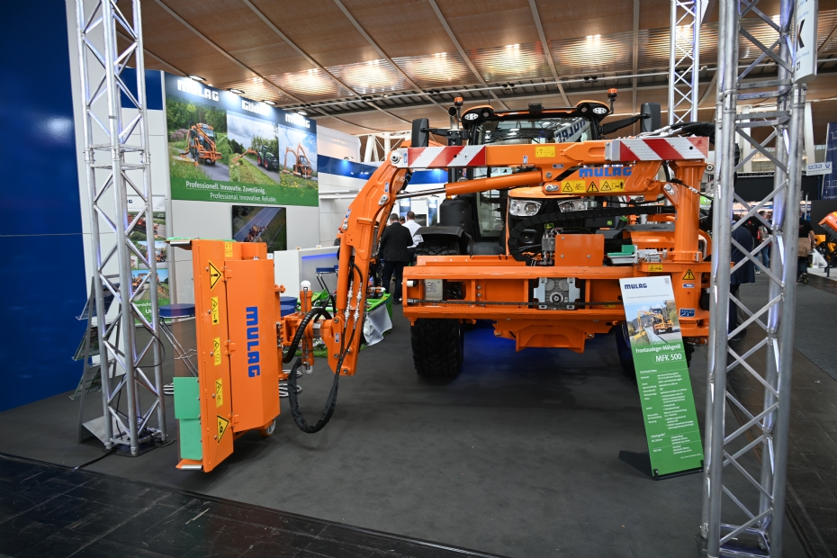 Güde Mulag toonde een heggenschaar en mulchmaaibak voor montage aan een maaiarm. De GHS-serie kent werkbreedtes van 1,30 en 2,00 meter. Ook stond er een klepelmaaier (MFK 500) die tot circa 6 meter uit het midden van het voertuig kan werken. De combinatie maakt het mogelijk om zowel hagen te knippen als te mulchen, afhankelijk van de configuratie.