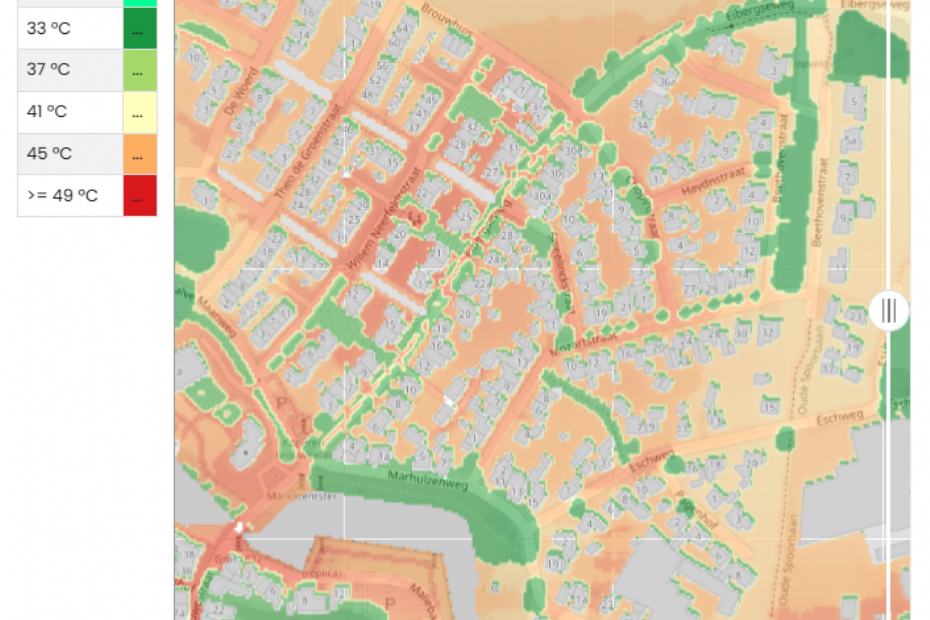 | | Een overzicht van de huidige situatie over 50 jaar, van de gevoelstemperatuur in de wijk Oosteres. |