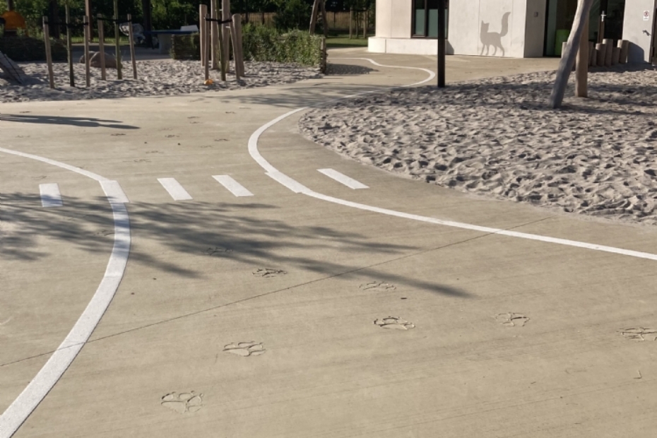 Voor de verharding is niet voor traditionele betontegels gekozen, maar voor een gesloten, drempelloze betonverharding. De verharding heeft een licht bezemstreek waardoor deze minder snel glad wordt in de winter. Opvallende details in het beton zijn de pootafdrukken die naar de verschillende entrees leiden. Deze sporen beginnen van bankjes die centraal op de parkeerplaats staan. Hierop staan 5 verschillende dieren. Elke dier begeleidt met zijn sporen op deze manier de kinderen naar de juiste entree.