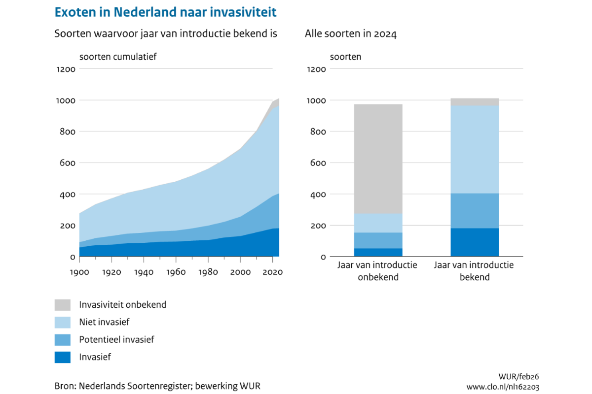Het aantal invasieve exoten in Nederland neemt al jaren toe. Vooral in de afgelopen veertig jaar is die groei versneld. Het gaat vooral om insecten en planten die hier terechtkomen via handel en transport, vaak afkomstig uit Europa, Noord-Amerika of Azië. Deze soorten kunnen schade veroorzaken aan natuur, infrastructuur en openbare ruimte. De totale kosten zijn lastig vast te stellen, maar lopen duidelijk op.
