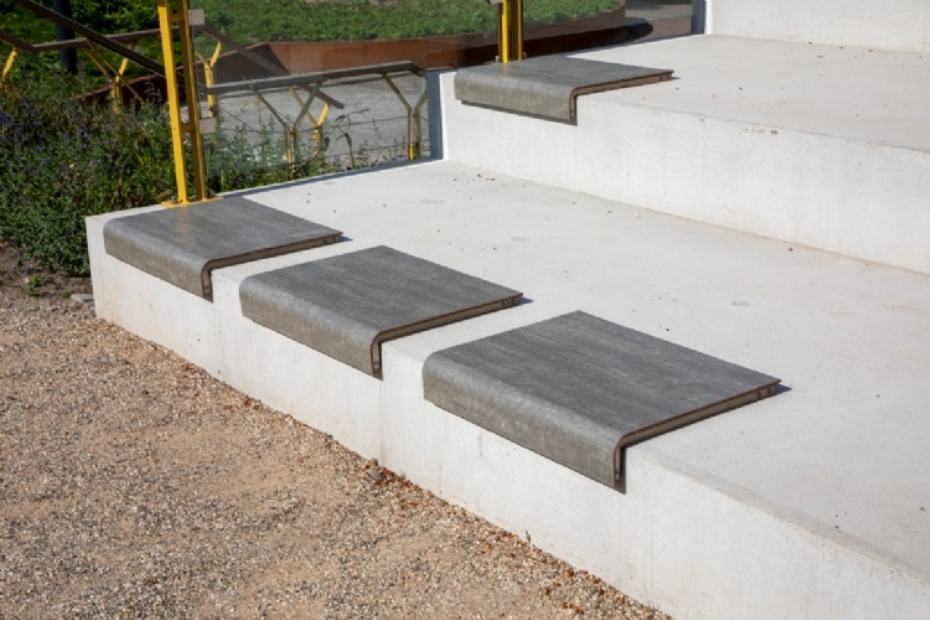 Een breed vormgegeven tribune-trap aan de rand van de stalling biedt verrassend zitcomfort op een plek waar je dat niet direct verwacht. Op deze trap zijn zitelementen gemonteerd. Dankzij de weerbestendige zitvlakken ontstaat hier een toegankelijke, comfortabele zitplek met een fraaie uitstraling.