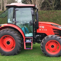 TYM compacttrekker – Deutz TCD2.9L4 motor – 75 pk – Power shuttle transmissie – Max rijsnelheid 39.1 km per uur – 90 Liter brandstoftank – 2320 kg hefarm lift capaciteit.