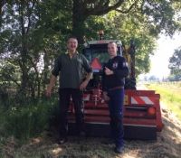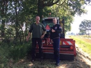 Voor het waterschap zijn er diverse wijzigingen aangebracht aan de klepelmaaier. Zo is de aandrijving verhuisd naar de rechterkant van de machine. Ook is er een trekhaak, gereedschapskist en bak voor de messen gemonteerd. Op de foto staan chauffeurs Wiecher Leideman en Dennis Tuitert tevreden bij hun nieuwe machine.