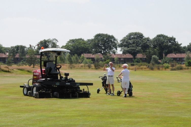 De Enk directeur Gerard van der Werf daarover: 'Je ziet jammer genoeg wel meer dan een strak maaipatroon. Het is de laatste tijd heel droog geweest en dan is het gras niet zo mooi groen als in het voorjaar. Maar als zelf het US Open op gele fairways wordt gespeeld is dat gelukkig niet erg meer.'