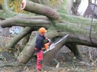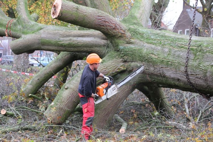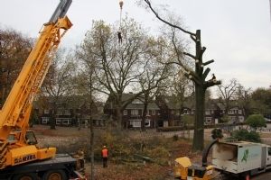 De takken van de veelbesproken monumentale moeraseik op het Versterplein in Vught worden verwerkt tot een kunstwerk. Behoedzaam werd de 120-jarige reus door medewerkers van Pius Floris Boomverzorging en Boomadvies van de Kroon ontdaan. "Het hout moet bruikbaar blijven en mag niet kapot splijten", zegt Sjaak van Doorn van Pius Floris. "Ze willen er schijven van zagen. De boom wordt daarom met een kraan in kleine stukken gedemonteerd. Best een bijzondere klus." De kap van de oude boom trok bekijks uit de buurt. "Toch jammer dat zo'n mooie boom tegen de vlakte gaat", reageert een buurtbewoner. "Maar ja, als hij ziek is....". Ook Gerard Velthuizen, directeur van woonstichting Woonwijze, sloeg de werkzaamheden gade.