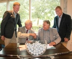 Voorzitter Hans van Weezel van Golfclub Zeegersloot in Alphen aan den Rijn en directeur Piet Oosthoek van de Oosthoek Groep uit Schipluiden hebben een overeenkomst ondertekend voor de renovaties van hole 12 en de afslagplaats van hole 3.