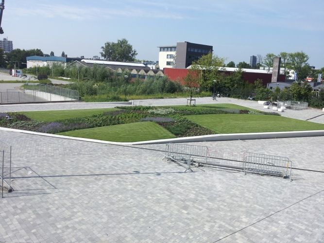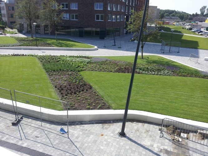 Voor de uitvoering is samenwerking gezocht met Hoek Hoveniers uit Voorhout, onder andere vanwege de specifieke omstandigheden van het project. Een gedeelte van het plan ligt als daktuin op de parkeergarage. Vanwege het gebruik van zowel vaste planten als gazon is met verschillende ondergronden gewerkt. Door de grote hitte in de periode van uitvoering is extra aandacht besteed aan de watervoorziening. Het project is uitgevoerd onder de garanties van Greentocolour, waarbij de vier pijlers (juiste plant-juiste plaats, voorbereiding bodem, 11cm kwaliteit plantmateriaal en later het maaien en mulchen) zullen instaan voor snel resultaat.