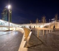 Het stationsgebied als maaiveld In haar ontwerp vatte Bureau B+B het stationsgebied op als één continu en coherent maaiveld. De vloeren van de ov-terminal, het busstation en de directe omgeving zijn voorzien van een natuurstenen bestrating die zich van binnen naar buiten voortzet. Ook de Oude Stationsstraat, die het station met de stad verbindt, kreeg deze natuurstenen vloer. Deze natuurstenen bestrating is toegepast in diverse legrichtingen en volgt het glooiende maaiveld, waarbij speciaal gevormde tegels zorgen voor vloeiende overgangen. De vloer is voorzien van roestvrijstalen afwateringslijnen en roestvrijstalen cijfers die verwijzen naar de hoogteverschillen en zo de topografie van dit gebied op subtiele wijze markeren. Hoogteverschillen worden opgevangen door natuurstenen plooien in het maaiveld.