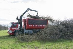 Van Weert Rondhout werkt met een nieuwe vrachtwagen een Volvo FMX met haaksysteem en 15 ton meter Epsilon kraan.