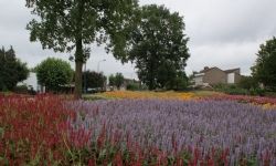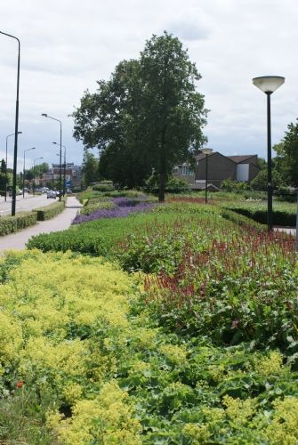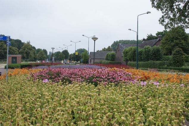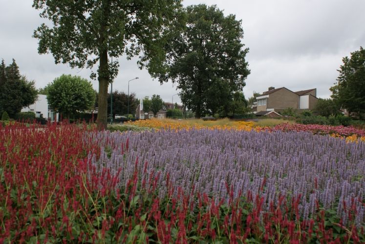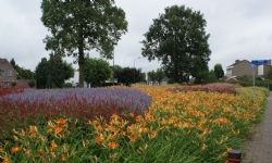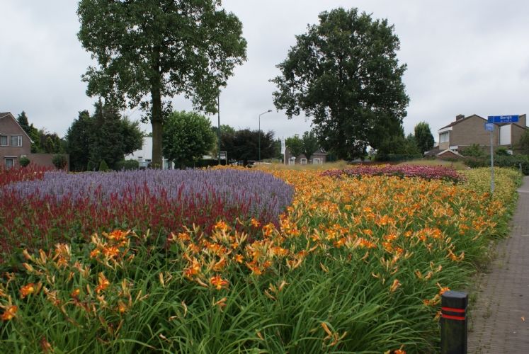 Een onderhoudsarme en kleurrijke wegberm met rijkbloeiende vasteplanten, dat is wat de gemeente Boxmeer wilde zien in een strook openbaar groen langs een belangrijke toegangsweg.