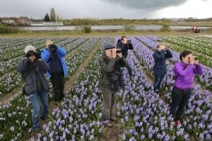 Engelse vogelbeschermers kijken samen met Nederlandse bollenkwekers en vogelkenners naar het rijke vogelleven bij een geïnundeerd veld.