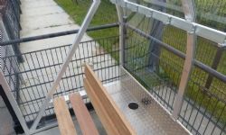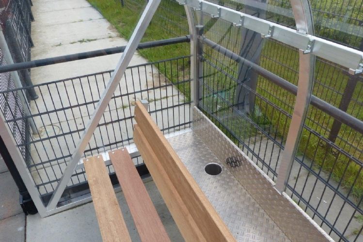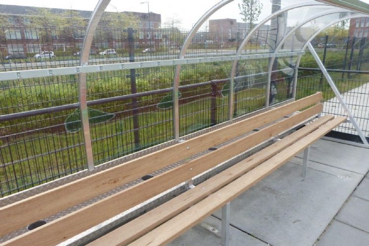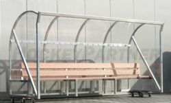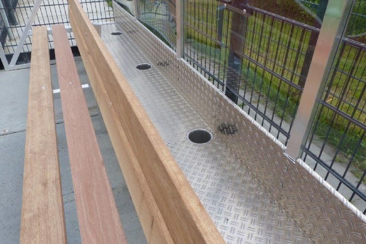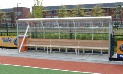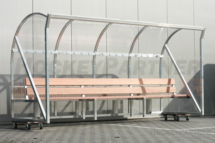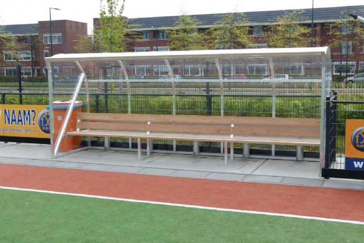 Deze speciale hockey dug-outs hebben een recht voorpand en zijn daarmee eenvoudig gelijk te plaatsen met de omheining. Het unieke van deze dug-out is dat de bank vooruit is geplaatst en hierachter voorzien is van een traanplaat tassendrager met hierin stickbins voor de opslag van hockeysticks. Daarnaast is deze special voorzien van geïntegreerde kledinghaken.