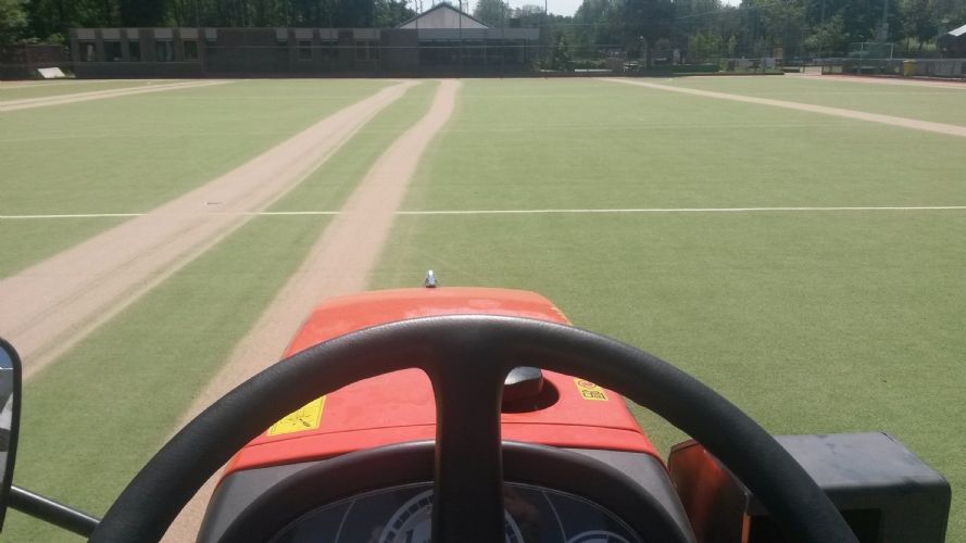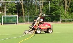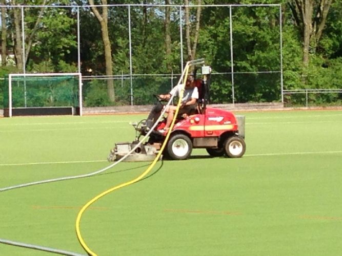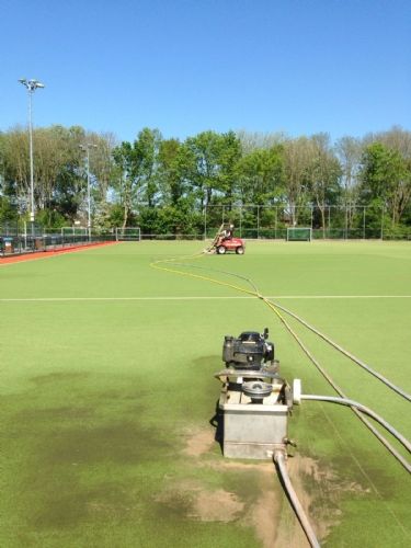 Het veld is diverse malen gereinigd door diverse aannemers waarbij het probleem elke keer in afzienbare tijd terug kwam. Het veld is door het vele reiniging veel zand verloren. In samenwerking met Ton de Rooij is een techniek ontwikkeld waarbij het vuil tot op de backing word verwijderd d.m.v. hoge waterdruk en direct in een naast het veld staande container wordt gepompt. Het overtollige water vloeit af uit de container en de algen en zand bezinkt in de container.