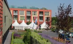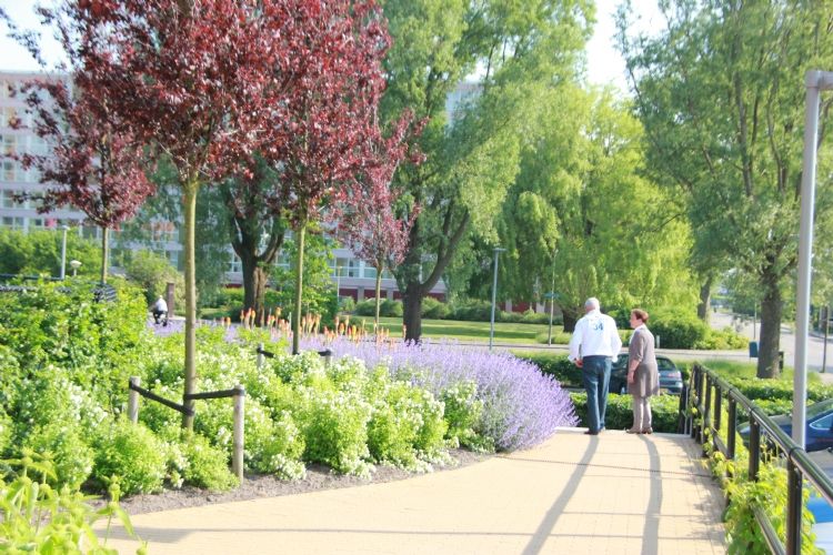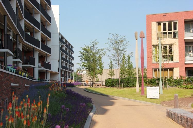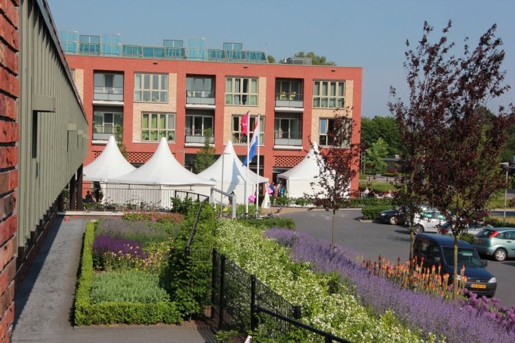 De vele hoogteverschillen in het terrein hebben ons voor diverse uitdagingen gesteld: veiligheid en toegankelijkheid is juist voor deze bewoners van groot belang. In de conceptfase zijn de functies en de belevingswaarden van het plan in een ideale vormgeving geprojecteerd. In de nadere invulling zijn prettige en veilige hellingbanen vervolgens leidend geweest voor de exacte maatvoering. Naast veel aandacht voor bijvoorbeeld details en kleurgebruik in de verharding, is in het plan speciale aandacht uitgegaan naar de beplanting. De structuur van de tuin wordt door het plan geaccentueerd met als uitgangspunt ruim jaar rond te ervaren sierwaarde. Geen "gemeente plantsoen" maar een echte tuinervaring, met details en kleuraccenten die ook vanuit de appartementen op de hogere verdiepingen te beleven zijn. Het complex is woensdag 1 juni 2016 geopend. Het betreft Design en Construct-ontwerp, -werkvoorbereiding, -aanleg en -onderhoud. Bijzonder is dat het onderhoud mede door SW-medewerkers wordt uitgevoerd. Aanneemsom: 842.548,24 euro Naam opdrachtgever: Zorgpartners Friesland Contactpersoon opdrachtgever: de heer P. (Pier) Attema, bureau- en bouwmanager Contactgegevens opdrachtgever: Henri Dunantweg 2, 8934 AD Leeuwarden Naam architect: Frank Rutten Contactpersoon architect: Frank Rutten, architect-directeur bij Architectenbureau Rutten van der Weijden Contactgegevens architect: Lloydstraat 198, 3024 EA Rotterdam Naam aannemer: Donkergroen, project is ontwikkeld en uitgevoerd door Donkergroen Contactpersoon aannemer: Elwin de Vink, Hoofd ontwerp en advies, Johan Louwerse Commercieel Adviseur Contactgegevens aannemer: Donkergroen, Harste 5, 8602 JX Sneek
