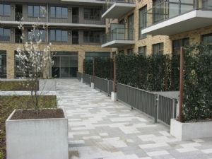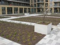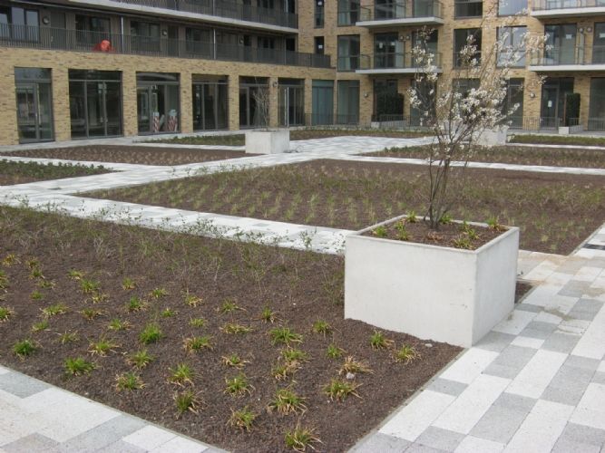 De binnentuin is aangelegd op een kelderdek en zal in de toekomst omgeven worden door bebouwing. Het ontwerp kenmerkt zich door een verharding bestaande uit massieve rechthoekige tegels met een natuurstenen afwerking, uitgevoerd in wit en grijstinten. In de verharding zijn grote rechthoekige plantvakken opgenomen die op haar beurt weer worden onderverdeeld in langgerekte stroken beplanting uitgevoerd in één soort. De beplanting bestaat uit vaste planten en grassen. Op enkele hoeken van de plantvakken zijn strak betonnen bloembakken gesitueerd waarin bloeiende solitairstruiken zijn geplaatst.