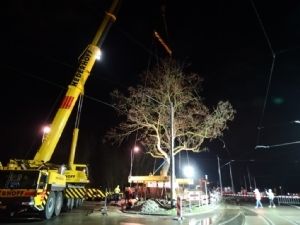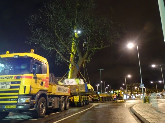 De grote, beeldbepalende bomen zijn verplant volgens de 'pallet-methode'. De volwassen grote bomen zijn circa vier jaar geleden op hun verplanting voorbereid door het maken van een wortelkluit die de bomen tijdens hun verplanting mee krijgen. Iedere wortelkluit heeft een afmeting van 16 vierkante meter. Tijdens het maken van de kluit zijn boomwortels verwijderd aan de randen van de kluiten. Water en voedingsgiften houden de bomen gezond. Hierdoor gaan de bomen in hun kluiten meer boomwortels ontwikkelen en worden zij geschikt om te verplanten. Aanneemsom: 96.000,- euro Naam opdrachtgever: Gemeente Amsterdam afdeling Grond en Ontwikkeling Contactpersoon opdrachtgever: Maria Geelen Contactgegevens opdrachtgever: 06- 11377599 Naam architect: Ruwan Aluvihare Contactgegevens architect: 020-2551702 of 06-12335094 Naam aannemer: Donkergroen, onderaannemer Nationale Bomenbank Contactpersoon aannemer: Dirk Doornenbal Contactgegevens aannemer: 06-53693916