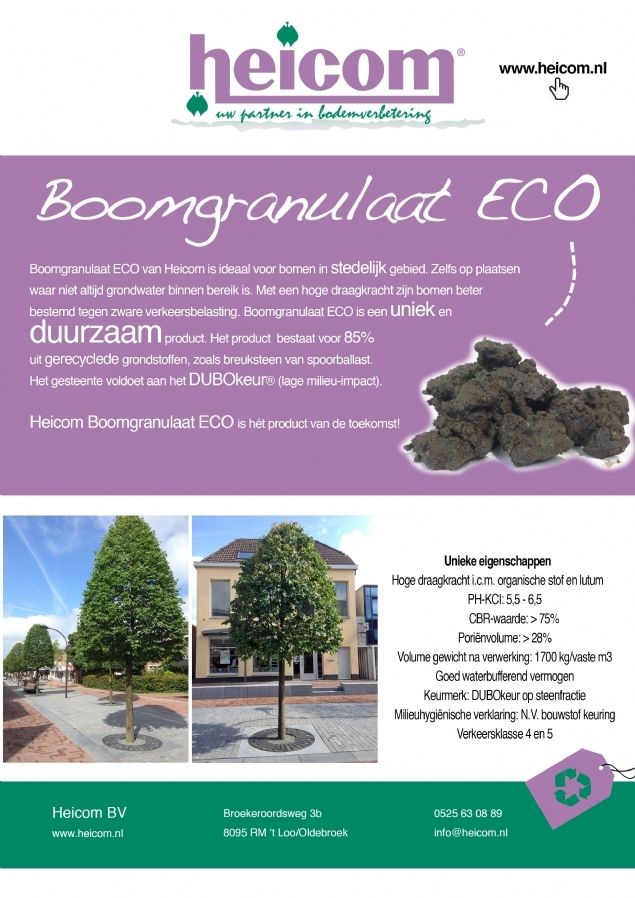 Bomenzand is een product met een uitgebalanceerde samenstelling, waardoor het flexibel en voedzaam genoeg is om voldoende groei van bomen toe te laten. Daarnaast zorgt het ook voor voldoende draagkracht bij licht belaste verhardingen. Zwaarder en intensief belaste wegen, pleinen en parkeerplaatsen vragen echter om een stabiel en een niet nazakkende funderingslaag. Voor deze situaties heeft Heicom boomgranulaat ontwikkeld. Afhankelijk van de toepassing en omgevingsfactoren en boomsoort kan er gekozen worden voor boomgranulaat op basis van basalt/lava met een speciaal samengestelde bomengrond, een boomgranulaat op basis van grauwacke met klei en additieven, of boomgranulaat ECO op basis van gerecyclede breuksteen, die voor minimaal 85% uit gerecyclede grondstoffen bestaat. De stabiliteit wordt in belangrijke mate bepaald door het korrelskelet. Hierbij is de korrelverdeling en de korrelvorm zeer belangrijk. Het gaat hierbij om een zo goed mogelijk klimaat met betrekking tot doorwortelbare ruimte, luchttoevoer, het bufferen van voedingsstoffen en draagkracht. Naast de eisen die gesteld worden aan het boomgranulaat, moeten er ook eisen gesteld worden aan het plantgat.. Het RAG-keurmerk is een onafhankelijk keurmerk dat de keten van grondstof tot en met substraat controleert. Dit biedt extra zekerheid voor de afnemer. Heicom beschikt over de mogelijkheid als één van de eersten in Nederland om met een LWD-meting in het veld de stijfheid en het lastspreidend vermogen van het aangebrachte boomgranulaat te meten. Om zo de juistheid van de verwerking van het boom te kunnen meten. Boomgranulaat ECO is de laatste ontwikkeling op gebied van boomgranulaat waar duurzaamheid en verbetering van kwaliteit een echte aanvulling is op huidige lijn boomgranulaten. Een unieke combinatie van gerecycled gesteente in combinatie klei met organische stof en een pH van 5.5 tot 6.5 met een zeer hoge draagkracht. Boomgranulaat ECO is ideaal voor bomen in Stedelijk gebied zelfs op plaatsen waar niet altijd grondwater binnen bereik is> Specificaties Boomgranulaat ECO: • Droge stofgehalte: > 80% gewichtsprocenten • Organische stofgehalte: 3-5% • PH-KCI: 5,5 - 6,5 • EC: <60 • Cl. (mg/l substraat) < 210 • Respiratiesnelheid: < 3 mmol O2/kg o.s./uur • CBR-waarde: > 75% • Porienvolume: > 28% • Doorlatendheid K-waarde: > 3,5 mm/minuut • Volume gewicht na verwerking: 1700 kg/vaste m3 • Waterbufferend vermogen: goed • Keurmerk: DUBOkeur op steenfractie • Milieuhygienische verklaring: N.V. bouwstof keuring • Geschikt voor de zwaarste verkeersklasse Hier kun je de bestekteksten voor het boomgranulaat ECO downloaden.