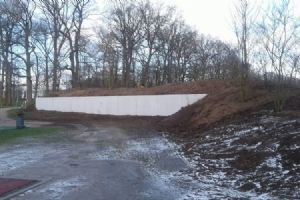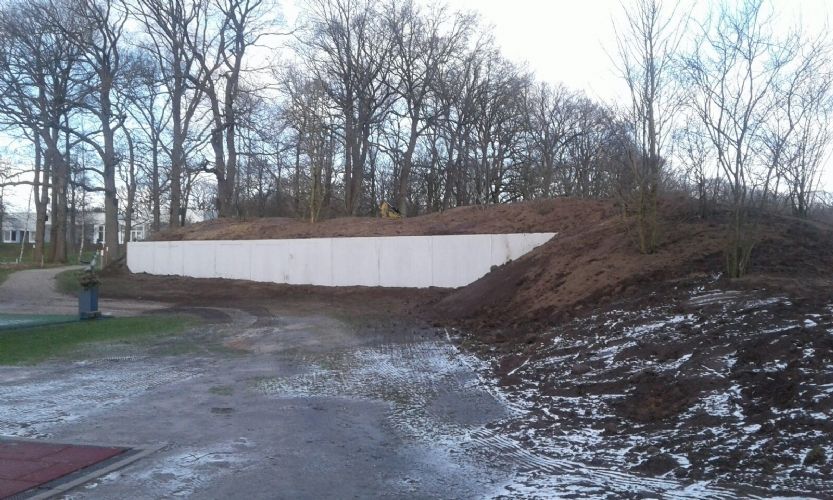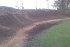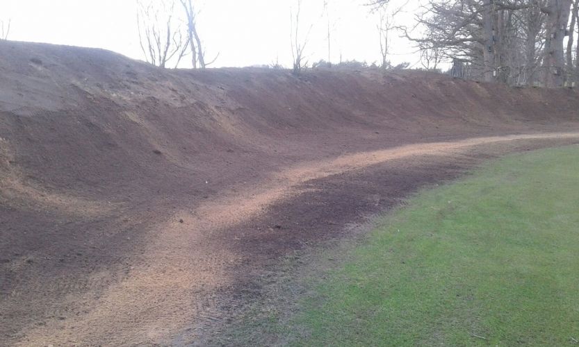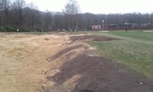 Uit de carry van de par 3 werd teelaarde afgegraven en daarmee is een glooiende 'mount' gerealiseerd achter de green. Tegelijkertijd is hiermee het zicht op het driving rangegebouw ontnomen. Michiel van der Vaart en de kraanmachinist van Aha de Man hebben het zand - dat in het zicht kwam na afgraven van de teelaarde -