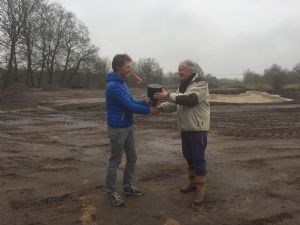 Op de foto de overhandiging van de vier nieuwe Toro infinity sproeiers door Arnoud Teeuwissen, projectleider Poseidon Beregening, aan Maarten van Rees, baancommissaris Anderstein.