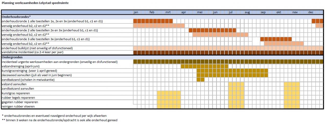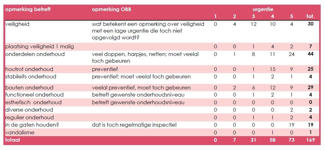 Het is ook een misverstand dat inspecties meerdere keren per jaar nodig zijn. Oost: ‘Inspectie is in veel gevallen maar eens per jaar nodig. Dat kan vaker, maar hoeft niet altijd; de frequentie is afhankelijk van het gebruik, de gevaarzetting (het risico op gevaar of schade) en de locatie. Daarover staan aanwijzingen in het technisch constructiedossier bij het toestel. Zo zal bij een metalen duikelrek, met amper losse delen en op een rubberen ondergrond, inspectie eens per jaar afdoende zijn. Vier vaste inspecties per jaar is dan geldklopperij.’ Het gevaar is daarnaast, stelt Oost, dat bij een lange lijst vaststellingen de dingen die een lage prioriteit hebben, helemaal niet worden uitgevoerd, omdat andere zaken voorrang krijgen. Dan kan het gebeuren dat een speeltoestel met houtrot logischerwijs prioriteit krijgt, maar het gevolg wel is dat de schommel nog een tijd zitjesloos blijft. Door de aannemer direct onderhoudsklussen te laten uitvoeren, ondervang je problemen en hoeft er minder vaak te worden geïnspecteerd. Inspectie en onderhoud kunnen bij dezelfde rondgang worden uitgevoerd. Aanleiding Voor de gemeente Lelystad heeft OBB een aanbesteding geschreven, waarin het voor de aannemer mogelijk is structureel onderhoud te plegen en inspecties daarin te integreren. Van de werkzaamheden wordt weliswaar een logboek bijgehouden, maar in het inspectierapport hoeven alleen aantekeningen te worden gemaakt van zaken die puur betrekking hebben op de veiligheid. Zo wordt de focus gelegd op goed onderhoud en wordt de frequentie van inspectie aangepast aan de gevaarzetting van het toestel. Elske Oost-Mulder, planoloog bij OBB Speelruimtespecialisten, was samen met Evert Buijsman, Hendrik Pars en Hans Verheul van de gemeente Lelystad verantwoordelijk voor de inschrijvingsleidraad. Over het proces vertelt zij: 'De huidige manier van werken zorgt voor veel werk bij de gemeente. Daar komt bij dat Lelystad zoals andere gemeenten een regiegemeente wordt, waardoor ze meer op afstand zet. Zo ontstond de vraag: kunnen we niet iets verzinnen wat vergelijkbaar is met het werken met een eigen dienst? Door deze manier van aanbesteden wordt gezorgd voor snellere opvolging en zullen de opnames beter overeenkomen met de oplossing, omdat dit veelal door dezelfde partij gebeurt.' Volgens Hendrik Pars, beheerder van de openbare ruimte in Lelystad, sloot het voorstel tot deze andere manier van werken goed aan bij de behoefte om meer grip te krijgen op de speeltoestellen. 'Op deze manier komen we meer in control. Preventief onderhoud is bovendien goedkoper dan reactief onderhoud.' Opzet overeenkomst Lelystad leent zich goed voor deze vernieuwende manier van aanbesteden, omdat het een relatief onderhoudsarm 'speelplekkenpark' heeft. Ten opzichte van landelijke gegevens zijn de ruim 1.500 speeltoestellen relatief jong en van goede kwaliteit. Ze zijn vaak van metaal en voorzien van kunstgras (waardoor de toestellen trager slijten). 1.098 toestellen zijn jonger dan vijftien jaar, 427 stuks ouder dan vijftien jaar, waarvan 67 ouder dan 20 jaar. Bij inspecties in 2016 en 2017 werden bij 163 toestellen 250 opmerkingen genoteerd. Als je de opmerkingen over bijvoorbeeld ondergrond of meubilair daarvan aftrekt, houd je 180 toestelspecifieke opmerkingen bij 118 toestellen over. Bij de huidige werkwijze wordt in een veiligheidsrapportage een (veiligheids)opmerking gemaakt: wat moet er gebeuren en met welke frequentie? Deze opmerkingen worden door de gemeente beoordeeld. Zij kijkt wat er moet gebeuren en welke prioriteit de werkzaamheden hebben; vervolgens wordt er onderhoud uitgevoerd. In een beheerprogramma wordt per toestel ingevoerd welke werkzaamheden er zijn gedaan. Een behoorlijk aantal van de opmerkingen heeft betrekking op onderhoud, of kan met regulier onderhoud in de toekomst worden ondervangen (zie figuur 1). Deze notities horen eerder op een werklijst. Andere notities ('in de gaten houden') hebben geen toegevoegde waarde. De tekst loopt door onder de afbeelding