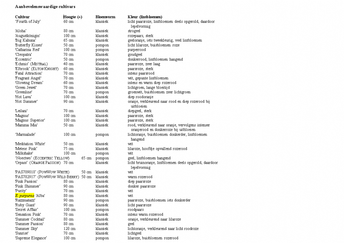 In de eerste Naamlijst van Vaste Planten (1988) werden negen cultivars van Echinacea vermeld. Twaalf jaar later, in de Naamlijst die in 2000 verscheen, waren dit er achttien. In 2010 waren dat er ineens 78, en in de recentste uitgave (2016) is dit aantal gestegen tot 212 cultivars!