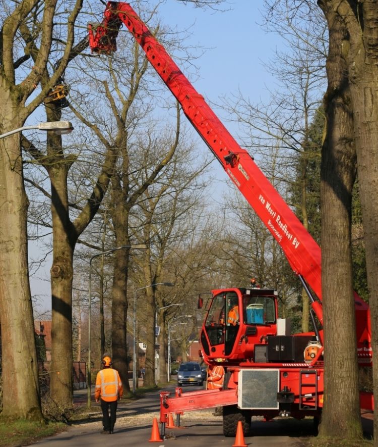 Willem-Jan van Weert neemt me mee naar zijn machineloods. De meeste machines zijn natuurlijk op locatie bij klussen, maar één grote Merlo 60.24-verreiker met een GMT-zaagkop staat er nog. Deze machine heeft een bereik van 26 meter inclusief jib en kan daarmee op de moeilijkste plekken een boom veilig 'uitkleden'. 'Natuurlijk zijn wij gek op de rotklussen waar andere mensen niet aan durven te beginnen, maar wij willen ook zo snel en zo veilig mogelijk werken. Dat kan met deze geweldige machine! Dat houdt onder andere in dat wij zo weinig mogelijk met de hand door middel van klimtechnieken proberen te werken, maar soms kom je daar natuurlijk niet onderuit. Hoe groot je machine ook is, het houdt een keer op.'