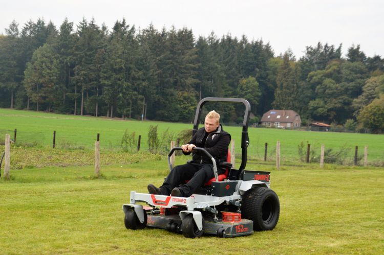 'Achterop heeft hij een accu unit en er zit een maaidek onder met drie mesmotoren', legt Teeuwen uit. 'Hij heeft geen V-snaaraandrijving, alles is volledig elektrisch; de maaihoogteinstelling, het aanzetten van de messen, het rijden. Degenen die hem uitproberen zijn allemaal verrast over de kracht van de motor, die niet lijkt te corresponderen met het weinige geluid dat je hoort. De Tourno-Z heeft twee wielmotoren die ook tegenover elkaar kunnen draaien. De wendbaarheid is echt uitzonderlijk. Hij wordt bestuurd met twee sticks, hij is stil, emissievrij, heeft weinig trilling en er kan vierenhalf uur mee worden gemaaid.'