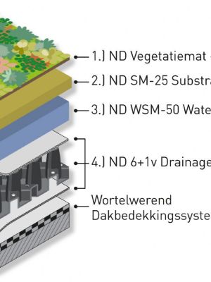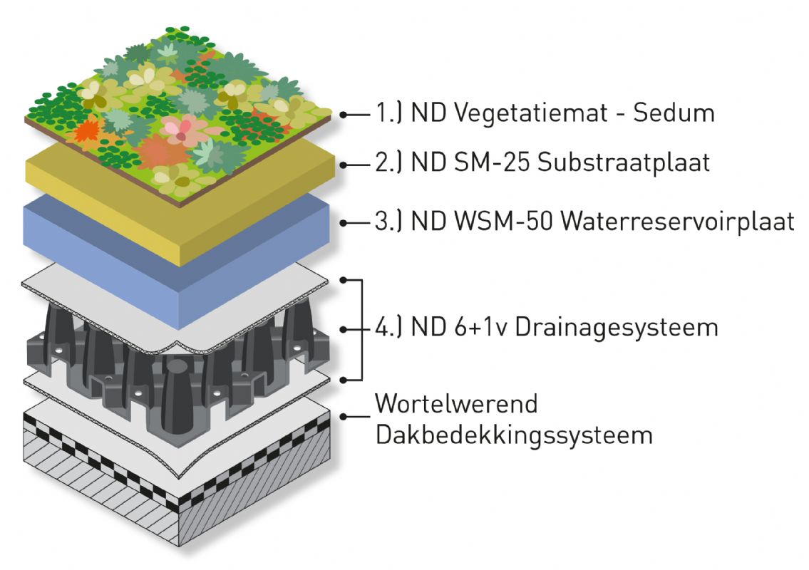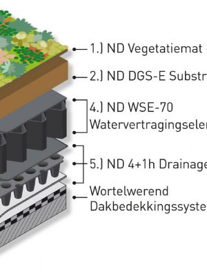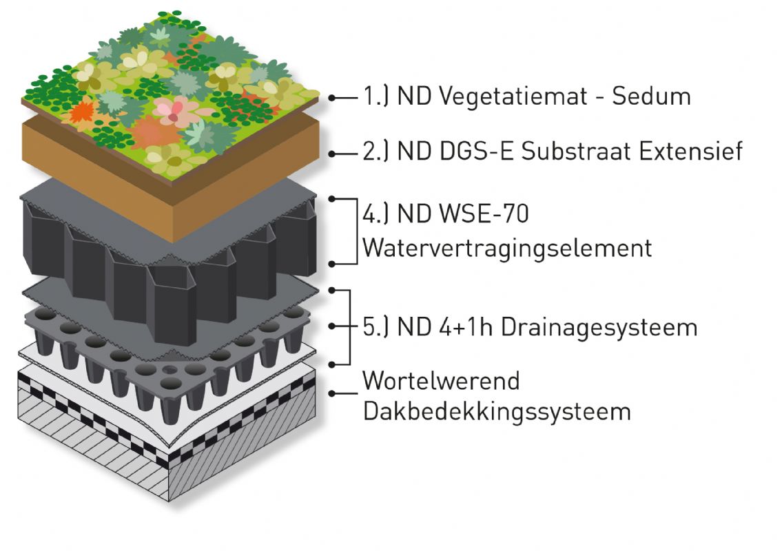 Naast het waterbufferingsdaksysteem heeft Nophadrain ook zijn eigen waterretentiedaksysteem ontwikkeld. Hoofddoel is vertraging van het regenwater, om zo het riool te ontlasten. Het regenwater dat niet door de vegetatie en vegetatiedragende laag worden vastgehouden, stroomt in het ND WSE-70-watervertragingselement. Via het ND 4+1h-drainagesysteem en daarna via een speciale dakafvoer wordt het hemelwater vertraagd aan het riool afgegeven. Zo komt de neerslag niet in één keer in het riool terecht en wordt regenwateroverlast tegengegaan.