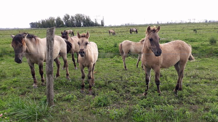 De dieren in de Noordwaard lopen vrij rond, maar dat betekent niet dat ze aan hun lot worden overgelaten. De Bode houdt zich dagelijks bezig met het monitoren van de dieren, ze geeft excursies en lessen aan kinderen. Haar grootste zorg is het welzijn van de kuddes. 'Zijn de dieren gezond, moeten we ingrijpen? Die vragen stel ik mezelf. We zorgen dat de dieren op tijd geëvacueerd worden bij hoog water. Het is een laaggelegen gebied, dus dat gebeurt vaak. We zetten de dieren dan op een terp waar ze gevoerd worden. Wij hebben zorgplicht voor de dieren.' In de Noordwaard grazen Schotse hooglanders, konikpaarden en waterbuffels. De waterbuffels zijn relatief nieuw in het gebied; de kudde is er in 2016 bij gekomen. 'We zijn met de waterbuffels begonnen omdat ze goed overweg kunnen met een nat gebied als de Noordwaard. Er zijn veel kreken die voor paarden niet aantrekkelijk zijn om over te steken. De waterbuffel daarentegen vindt het één groot feest. Ze kunnen ontzettend goed zwemmen; daardoor komen ze op plekken waar de paarden niet komen.' Konikpaarden komen tot rust De Noordwaard is ook deels ingericht als recreatiegebied, waardoor de dieren af en toe in aanraking komen met mensen. Volgens De Bode is dat geen probleem. 'In het gebied waar de waterbuffels staan, is heel veel water. Het is toegestaan om er te wandelen, maar door alle kreken doen weinig mensen dat in de praktijk. Wel zijn er veel fietsers, maar zij fietsen buiten het begrazingsgebied. De waterbuffels zijn voor mensen wel goed te zien. Dat vinden de buffels prima. Ze zijn niet gevaarlijk of agressief, maar ze kunnen wel nieuwsgierig zijn. Als ze kalfjes hebben, zijn ze extra alert, waardoor ze zich eerder zullen terugtrekken.' Dieren komen in de Noordwaard juist tot rust. Een goed voorbeeld zijn de konikpaarden die vrij rondliepen op het Nijmeegse Waalstrand. De dieren werden regelmatig gevoerd door strandbezoekers, wat leidde tot opdringerige paarden en dus gevaarlijke situaties. Toen de paarden niet langer houdbaar waren in het gebied, was er even sprake van slachting van de paarden, maar na een petitie werd dat plan van tafel geveegd. De paarden leven nu in de Noordwaard. 'Ze doen het goed; de komende jaren kunnen ze hier blijven lopen. Ze komen niet in aanraking met mensen.'
