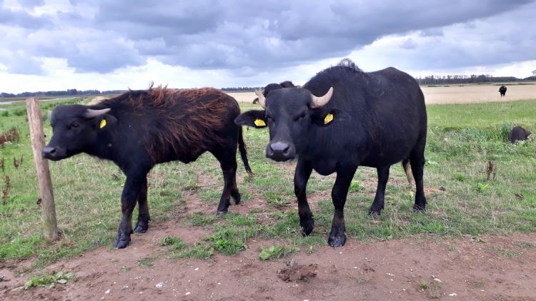 De komst van de waterbuffels naar de Noordwaard was voor Free Nature reden om de dieren eens goed onder de loep te nemen. Want zijn ze nu echt zo dol op water als hun naam doet vermoeden? Hoe vaak eten ze, wat is hun ritme, zwemmen ze of badderen ze zelfs? Met gps-halsbanden werd de kudde een maand lang nauwlettend gevolgd. Uit het onderzoek blijkt dat de buffels 48 procent van de tijd grazen, 33 procent liggen en 11 procent zwemmen. De overige 5 procent van de tijd besteden ze aan staan, lopen en overig gedrag. De buffels hebben minder zweetklieren dan runderen; om af te koelen zijn ze dus afhankelijk van modder en water. Daarom is gekeken naar het verband tussen de buitentemperatuur en het aantal keren dat de waterbuffels in het water zijn gespot. De Bode: 'Het was heel leuk om aan te tonen dat de buffels met warm weer lekker badderen en bij lagere temperaturen het water gebruiken om over te steken. Ze besteden veel tijd aan eten en herkauwen. We hebben ook gekeken naar de verschillen tussen kalveren en volwassen buffels.' Nieuw leven in de kudde Er is een verschil waargenomen tussen de activiteiten van kalveren, jaarlingen en volwassen waterbuffels. De kalveren en jaarlingen gedragen zich bijna hetzelfde als de volwassen dieren, alleen grazen zij minder vaak. De jonge kalveren worden gevoed door hun moeder en hoeven daardoor minder te grazen. Ze liggen ook vaker, omdat ze nog moeten groeien. Ten tijde van het onderzoek waren de kalveren een half jaar oud, de jaarlingen waren ongeveer één jaar oud en de volwassen dieren in de kudde waren tussen de drie en acht jaar oud. 'De afgelopen zomer zijn er in de kudde zes kalfjes geboren. Ze lieten lang op zich wachten, maar ze hebben een inhaalslag gemaakt.' Als de groep te groot wordt, moet de kudde uit elkaar gehaald worden en zal een aantal buffels weer ingezet worden in een ander natuurgebied.