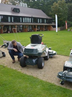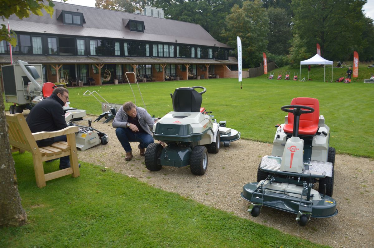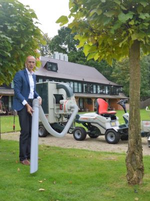 Buiten staan verder Cara-verticuteermachines van Cramer: de Cara47, de Cara60 en de door een zitmaaier getrokken uitvoering Cara60T. Er zit ook een bladblazer bij; die is nieuw. De bladzuiger, de LS 5000 ESW, is accu-aangedreven, maar die was er vorig jaar al. Met de nieuwe accutools heeft Cramer nu een range grasmaaiers en een accuveegmachine, de Cramer KM Domus.