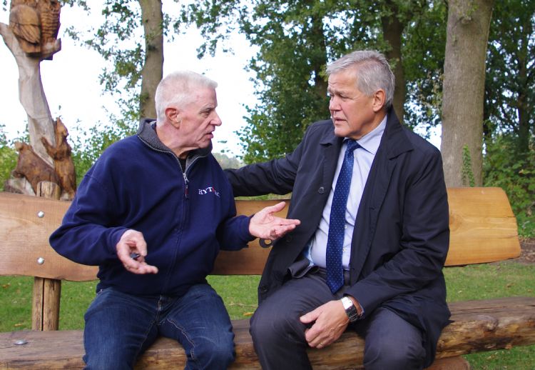 | Vrijwilliger Joep Arts praat wethouder Stoffels (r) bij over het Hapse Wandelbos |