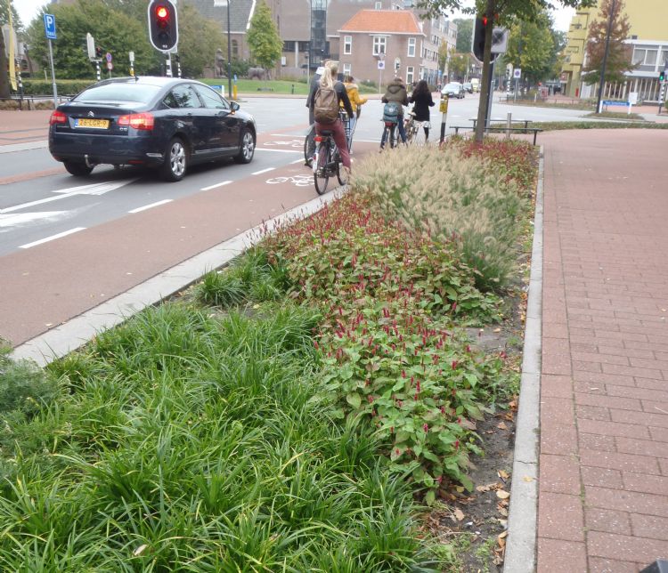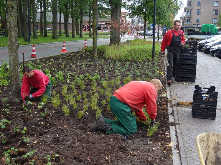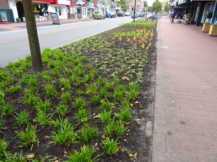Kwaliteitsplanten en grondverbeteringHet beplantingsontwerp voor de borders in de Wilhelminastraat was in het voorjaar van 2017 al gereed, maar uiteindelijk kon de aanplant van 12.000 vaste planten pas in september plaatsvinden. ‘Wij hadden het liever over de winter heen getild’, vertelt Wilfried Reuvers van Reuvers Buro voor Groene Ruimtes. ‘Want alle vaste planten waren toen al bijna uitgebloeid. Als je de aanplant in het voorjaar doet, zien de bewoners direct resultaat. Dan bloeit er van alles. Nu stond de aanplant er nog maar net in de winter. Ik kwam daar een keer op de fiets langs en zag een paar scholieren er dwars doorheen banjeren. Dat was net op een gedeelte waar geen paaltjes stonden. Als er al bloeiende planten hadden gestaan, was dat minder snel gebeurd. Maar het is best goed gelukt en het heeft donders mooi gebloeid het afgelopen voorjaar.’