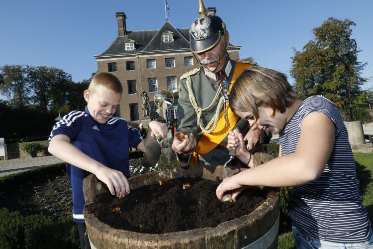 'Keizer Wilhelm II' plant begin oktober samen met kinderen van basisscholen uit Amerongen bloembollen. Op initiatief van de KAVB worden 75.000 lentebloeiers geplant in de tuinen van Kasteel Amerongen. Een groot gedeelte van de lentebloeiers wordt door bloembollenleverancier Lubbe uit Lisse machinaal onder de grasmat geplant. Tuinvrijwilligers maken de najaarsklus af. Het is 100 jaar geleden dat de Eerste Wereldoorlog werd beëindigd en de gevluchte Duitse keizer Wilhelm II op Kasteel Amerongen arriveerde; het kasteel heeft dit jaar daarom als thema 'Help, de keizer komt'. Bij de bloembollenkeuze is rekening gehouden met de historische omgeving, een gespreide bloeiperiode en meerjarige bloei. Passend bij de klassieke stijl worden diverse historische tulpen toegepast, waaronder Tulipa 'Keizerskroon' (1750), 'Marjoletti' (1894) en de gevlamde Rembrandttulp 'Insulinde' (1915). Tevens wordt in de kasteeltuin een exclusieve Muscari-collectie geplant: blauwe, maar ook witte, roze en crèmekleurige druifjes. In het gazon tussen het koetshuis en het kasteel worden twee stroken met nectarrijke bloembollen geplant, waaronder boerenkrokussen, wilde narcissen, bostulpen en sneeuwroem. Het plantseizoen loopt tot medio december. Vanaf het vroege voorjaar komen de eerste bloembollen tot bloei.