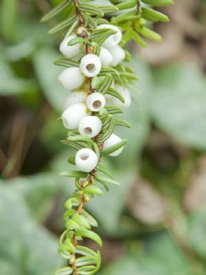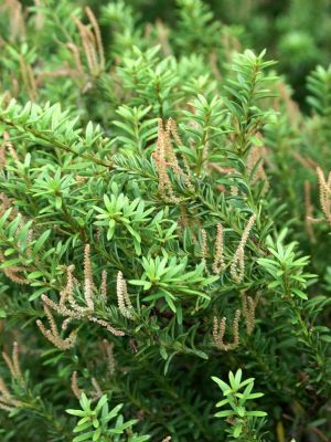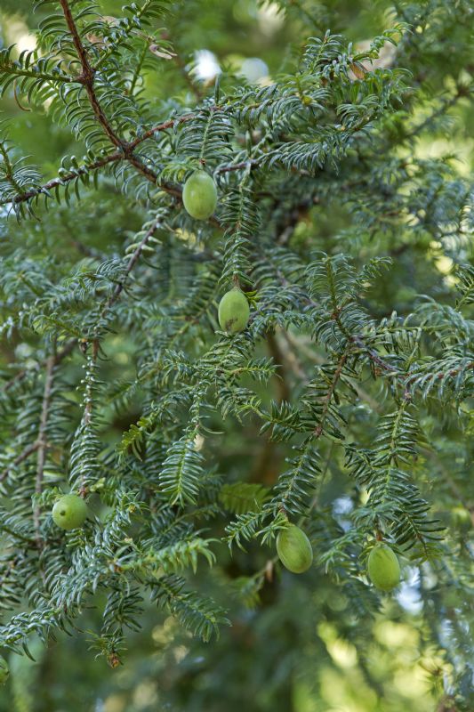 BladverliezendHet gros van de coniferen is wintergroen, maar een klein deel is bladverliezend. Heel bekend zijn natuurlijk Larix, Metasequoia en Taxodium. Veel minder bekend zijn Glyptostrobus en Pseudolarix. De loofstructuur van de bladverliezende coniferen is fijner dan bij de wintergroene. Glyptostrobus zijn zeer zeldzame kleine bomen met een slanke habitus, die het meeste lijken op Metasequoia, maar het geveerde loof is langer en fijner.Iets bekender is Pseudolarix amabilis. Deze statige boom is nauw verwant aan de veel bekendere Larix, maar natuurlijk zijn er verschillen. Zo is een Larix gewoonlijk veel slanker en maken deze bomen een wat ielere indruk dan Pseudolarix. De kegels van Pseudolarix bestaan uit driehoekige, vlezige schubben en vallen bij rijpen uiteen. Bij Larix blijven de kegels gewoonlijk meerdere jaren aan de twijgen zitten. De vrij lange, zachte naalden zijn heldergroen van kleur. P. amabilis verdraagt geen kalkrijke grond, maar zal verder op vrijwel iedere doorlatende bodem groeien. De boom houdt van warmte, dus een plek in de volle zon of lichte schaduw is prima. Voor een goede groei is het wel belangrijk dat de bodem goed afwaterend is en de plant voldoende voeding heeft. Bij gebrek aan voedingsstoffen zullen de naalden snel geel kleuren. P. amabilis is prima winterhard en kan een schitterende solitairboom vormen. Een mooie toegevoegde waarde van bladverliezende coniferen is dat ze herfstkleuren geven. Met name Pseudolarix is wat dat betreft een topper. Rond eind oktober kleuren de naalden diep goudgeel tot licht bruinoranje. Tekst loopt verder onder de afbeelding Lijkt op TaxusTaxus is zo veelzijdig en gemakkelijk, dat het vrijwel onmogelijk is om een vervanger hiervoor te vinden. En die zijn er ook niet echt in de wereld van de coniferen. Wel zijn er enkele lookalikes: PseudoTaxus chienii en Saxegothaea conspicua. Beide zijn voldoende winterhard om in ons land te worden toegepast, maar de eerlijkheid gebiedt te zeggen dat met name Saxegothaea niet veel toevoegt naast Taxus. Opvallend is dat Saxegothaea geen familie is van Taxus, maar er toch op lijkt. De donkergroene naalden glanzen en hebben een vrij scherpe top. Aan de onderzijde zijn twee grijze lenticelstrepen zichtbaar. Een groot verschil met Taxus is dat S. conspicua geen vlezige vruchten krijgt, maar ronde, groene kegeltjes die uit dikke schubben bestaan. S. Conspicua is voldoende winterhard voor toepassing in ons klimaat, maar naast Taxus voegt de plant eigenlijk niets toe aan onze tuinen en parken.Het grote geslacht Podocarpus bestaat voornamelijk uit subtropische soorten, maar enkele kortnaaldige soorten komen voor in Tasmanië en Nieuw-Zeeland. Deze zijn prima winterhard en kunnen dan ook goed bij ons worden toegepast. Het zijn geen moeilijke planten, die soms opvallende loofkleuren hebben. P. Nivalis is een klein struikje met korte, vrij brede en zachte naalden. Net als Taxus is P. nivalis tweehuizig; er zijn dus mannelijke en vrouwelijke planten. De iets minder winterharde P. Totara heeft wat scherpere naalden en groeit uit tot een grote piramidale struik of kleine boom. Vanwege de winterhardheid is het een goede plant voor serres en binnentuinen. 'Aureus' is een geelnaaldige cultivar met sprankelende loofkleuren. PseudoTaxus chienii is het beste te beschouwen als een Taxus met witte vruchten. Op jonge leeftijd moet de plant wel enigszins worden beschermd, maar als hij ouder is, is de winterhardheid goed. Toch is dit geen plant voor grootschalige toepassing, al was het alleen al omdat het een zeldzame verschijning is. Deze struik is in Zuidoost-China, het natuurlijk verspreidingsgebied, zeer zeldzaam en wordt zelfs met uitsterven bedreigd. Logischerwijs komt Taiwania van het gelijknamige eiland in de Chinese Zee. Het is een kleine tot middelgrote boom met een doorgaande harttak en sierlijk afhangende twijgen. De naaldvormige schubben lijken wel wat op die van de nauw verwante Cryptomeria, maar voelen scherp aan. Ze zijn donkergroen, soms wat blauwgrijs. De boom moet beschermd worden tegen strenge vorst en is dus alleen geschikt voor toepassing op milde, beschutte plaatsen. Iets minder zeldzaam zijn de soorten uit het geslacht Torreya. De bekendste soort is T. nucifera. Oppervlakkig gezien lijkt de plant op Taxus, maar de naalden staan steeds aan weerszijden van de twijgen (en niet rondom, zoals bij Taxus). Ook zijn de naalden veel stugger en scherp gepunt. De zaden zitten in een stevig vlezig omhulsel en niet in een kegel. De twee Noord-Amerikaanse soorten T. califonica en T. taxifolia zijn ook te herkennen door even een naald te kneuzen en hieraan te ruiken. Geurt de gekneusde naald naar citrusvruchten, dan is het Torreya. Ze vormen bomen die ook in ons klimaat meer dan 10 m hoog kunnen worden en kunnen dienen als alternatief voor boomvormige Abies of Picea. Van T. nucifera bestaat ook een cultivar met bont loof: 'Variegata'. De naalden van deze plant zijn deels (crème)wit. De meningen zijn verdeeld over de vraag of dit mooi is, maar spectaculair is het zeker wel!