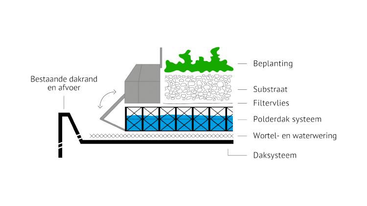 Een polderdak is een dak dat slim met regenwater omgaat. Alle neerslag die valt op het polderdak wordt tijdelijk vastgehouden en beschikbaar gemaakt voor hergebruik of naar het watersysteem afgevoerd. Onder elke vierkante meter dak worden tientallen liters water in een krattenstelsel opgevangen (zie tekening). Het primaire doel is wateroverlast voorkomen, het secundaire doel is het opgespaarde regenwater gebruiken, bijvoorbeeld om het gebouw en de omgeving op een natuurlijke manier te koelen. Sensoren op het dak meten de temperatuur en het waterpeil. Polderdak is een concept van het bedrijf MetroPolder company.