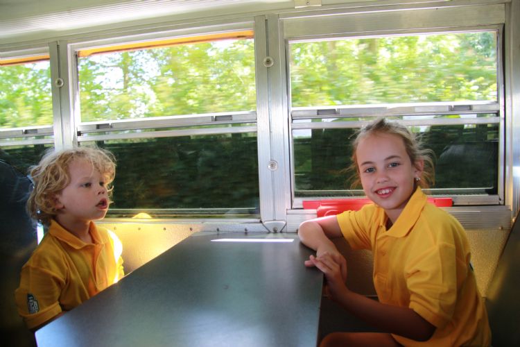 Op woensdag 3 juli was het zover, de kinderen werden in een heuse oude Amerikaanse schoolbus opgehaald op het schoolplein. Verschillende kinderen keken jaloers naar het hele gebeuren en vroegen beteuterd aan buschauffeur Toon Ebben: 'Hoe hadden we ons hiervoor kunnen inschrijven?'