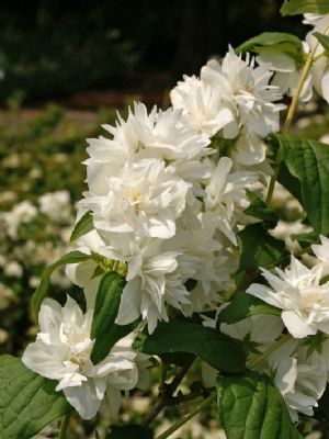 De naam boerenjasmijn is natuurlijk afgeleid van de echte jasmijn, vooral door de heerlijke geur die de bloemen van beide planten verspreiden. Verder hebben de planten niets met elkaar gemeen. Maar om nu te zeggen dat jasmijn (Jasminum) gedistingeerder is of meer verheven dan boerenjasmijn (Philadelphus) ... nee. De overdadige bloei met heerlijk geurende bloemen is door weinig planten te evenaren.