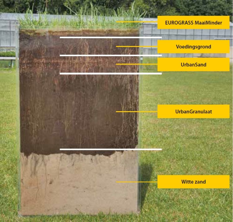 Maximale wortelgroei van EUROGRASS MaaiMinder door de verschillende substraatlagen heen.