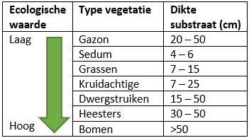 Tabel 1. Verschillende typen vegetatie met de minimaal noodzakelijke substraatdikte, gesorteerd op potentiële ecologische waarde De standaard toegepaste vegetatie is sedum. Deze heeft wel waarde, maar andere soorten dakvegetatie hebben een duidelijk grotere potentiële waarde, omdat er meer variatie is in structuur en in mogelijke waard- en drachtplanten. Combinaties van verschillende vegetatietypen zijn daarom het meest gewenst. Een combinatie van vetplanten, grassen, hoge bloeiende kruidachtige planten en dwergheesters heeft de grootse ecologische potentie (behalve wanneer bomen mogelijk zijn).