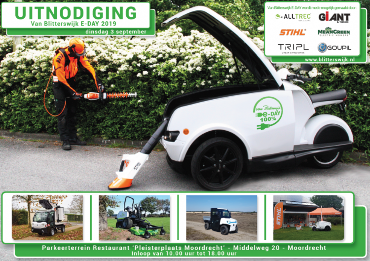 Zo ook in Moordrecht, tijdens de e-day zullen termen als duurzaam, zero-emissie en geluidsarm overheersen. Van Blitterswijk laat u zien wat er allemaal mogelijk is op het gebied van elektrisch, emissievrije werkvoertuigen en tuin- en parkmachines. Onder het genot van een hapje en een drankje vertellen de adviseurs u er alles over met demonstraties.